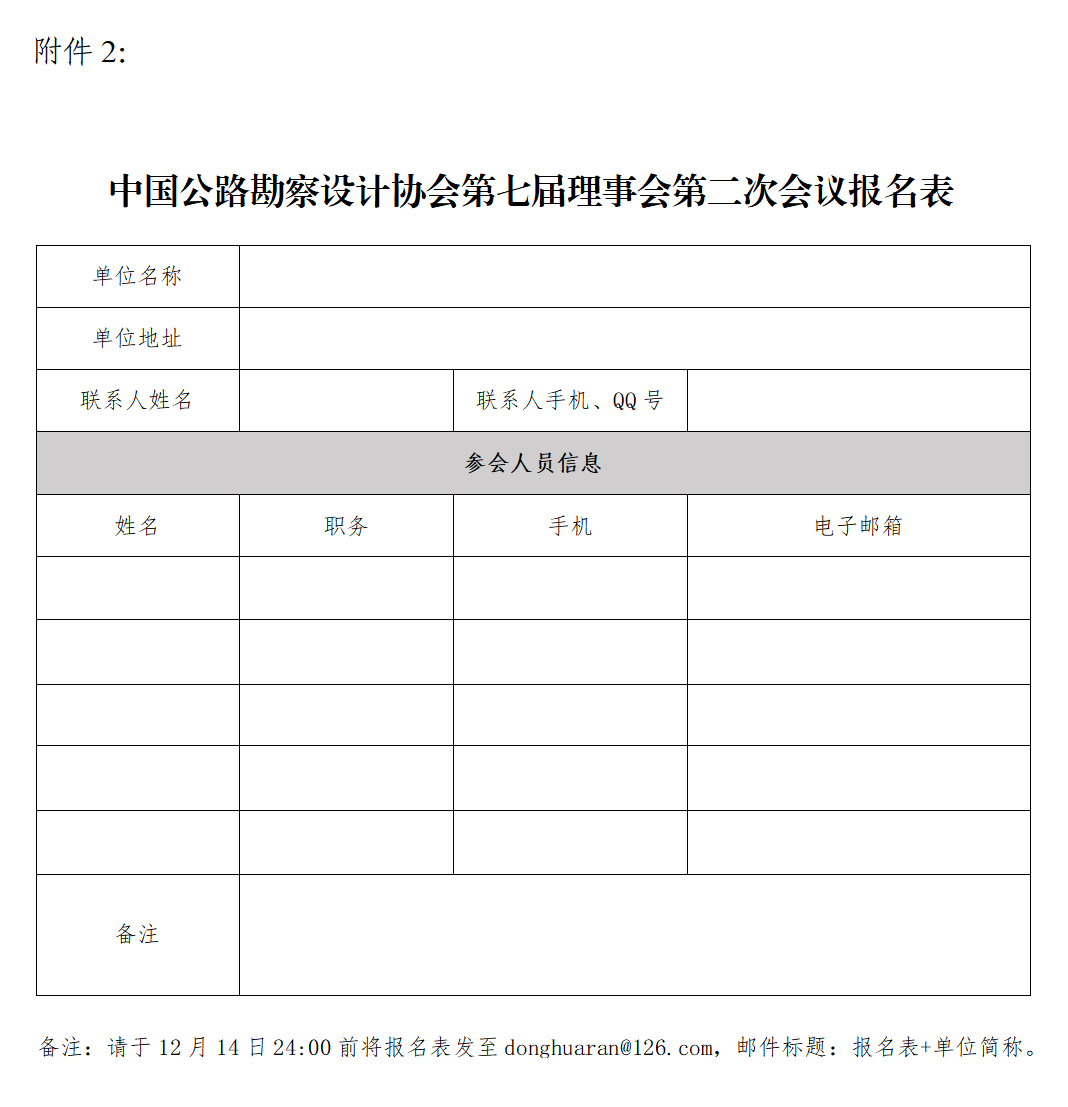 2、請于2022年12月14日24:00前將《中國公路勘察設計協會第七屆理事會第二次會議報名表》發至郵箱:donghuaran@126.com。