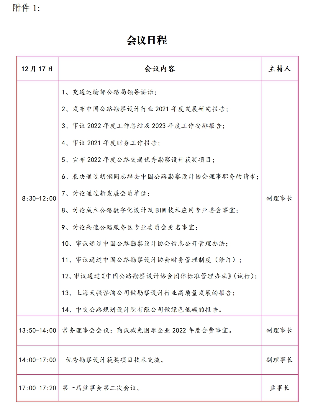 為加強勘察設計企業之間的交流溝通,中國公路勘察設計協會定于2022年12月17日召開第七屆理事會第二次會議、第七屆理事會第二次常務理事會議、第一屆監事會第二次會議(監事參加)。在當前全國新冠疫情防控形勢下,擬采取線上視頻和現場會議相結合的方式召開,現場會議地點在北京市。現就有關事項通知如下: