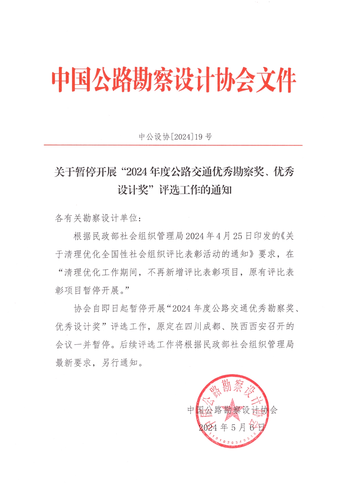 關于暫停開展“2024年度公路交通優(yōu)秀勘察獎、優(yōu)秀設計獎”評選工作的通知