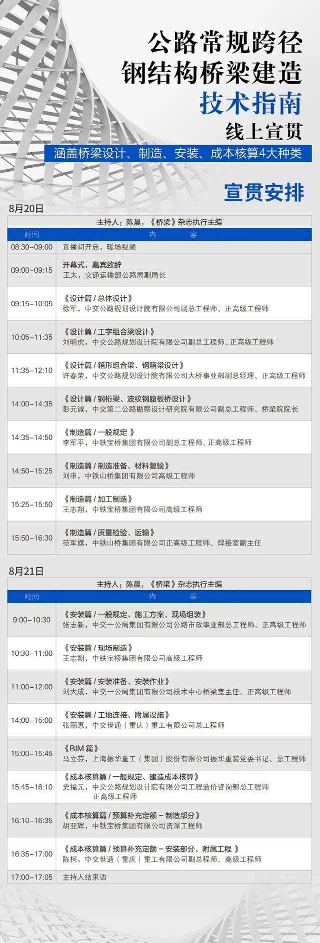 疫情擋不住學習的腳步。為落實《交通強國建設綱要》和《關于推進公路鋼結構橋梁建設的指導意見》要求,推動公路基礎設施高質量發展,加快推進鋼結構橋梁建設,8月20-21日,由中國公路勘察設計協會主辦,中交公路規劃設計院有限公司、《橋梁》雜志社共同承辦的《公路常規跨徑鋼結構橋梁建造技術指南》線上宣貫培訓,一改以往線下培訓的傳統模式,按照疫情防控的要求,以網絡直播、免費在線觀看學習的新形式,與大家見面,受到業內廣泛好評。培訓直播期間,共有2萬余人次在線觀看直播。