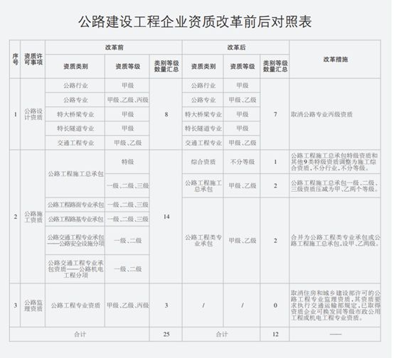 經(jīng)充分研究論證,《改革方案》共提出了六個方面的改革舉措:一是精簡資質(zhì)類別,歸并等級設(shè)置。將大幅壓減企業(yè)資質(zhì)類別和等級,改革后住房和城鄉(xiāng)建設(shè)部門許可的25項公路資質(zhì)將壓減至12項,壓減幅度為52%。其中公路設(shè)計資質(zhì)由8項壓減為7項,公路施工資質(zhì)由14項壓減為5項,特別是住房和城鄉(xiāng)建設(shè)部門許可的3項公路監(jiān)理資質(zhì)將全部取消。二是放寬準(zhǔn)入限制,激發(fā)企業(yè)活力。將進一步優(yōu)化企業(yè)資質(zhì)標(biāo)準(zhǔn),重點考慮放寬人員、業(yè)績、技術(shù)裝備等指標(biāo)要求。三是下放審批權(quán)限,方便企業(yè)辦事。考慮除甲級及以上等級資質(zhì)外,將公路行業(yè)其他等級資質(zhì)下放至省級及以下主管部門審批審查。四是優(yōu)化審批服務(wù),推行告知承諾制。加快推行告知承諾制,全面實行全程網(wǎng)上申報和審批,大幅削減不必要的證明材料。五是加強事中事后監(jiān)管,保障工程質(zhì)量安全。將加大審批后動態(tài)監(jiān)管力度,深入推進信用體系建設(shè),強化個人執(zhí)業(yè)資格管理,探索建立個人執(zhí)業(yè)責(zé)任保險制度。六是完善招標(biāo)投標(biāo)制度,發(fā)揮市場機制作用。將繼續(xù)完善招投標(biāo)制度,優(yōu)化調(diào)整招標(biāo)條件設(shè)置,引導(dǎo)建設(shè)單位更多從企業(yè)實力、技術(shù)力量、管理經(jīng)驗等方面選擇企業(yè)。同時,《改革方案》明確,設(shè)置1年過渡期,到期后實行簡單換證,按照新舊資質(zhì)對應(yīng)關(guān)系直接換發(fā)新資質(zhì)證書,不再重新核定資質(zhì)。另外,在新的資質(zhì)管理規(guī)定和標(biāo)準(zhǔn)實施前,預(yù)計現(xiàn)有資質(zhì)管理體系仍將繼續(xù)運行,有關(guān)資質(zhì)申報和審查工作不受影響。