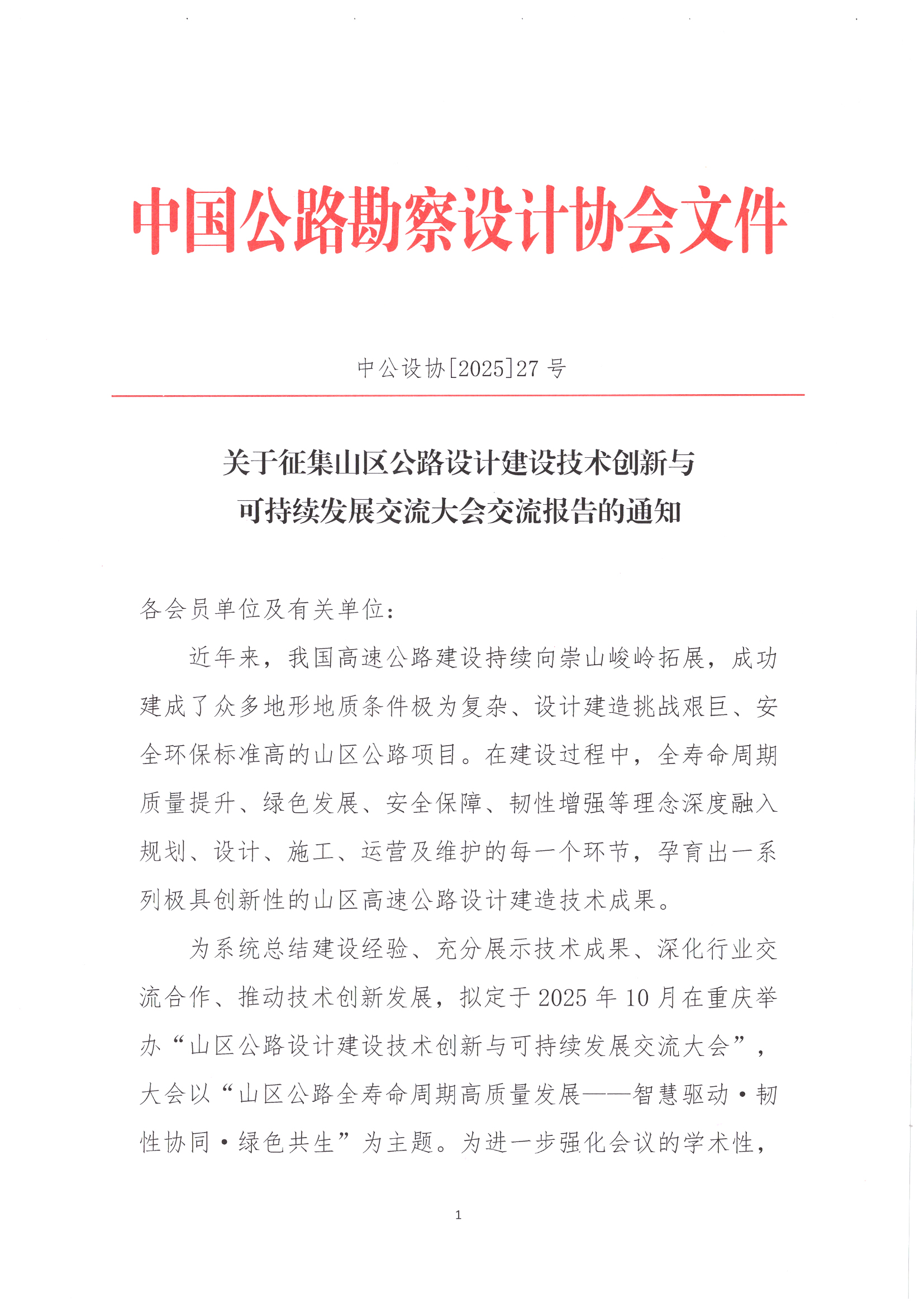 關(guān)于征集山區(qū)公路設(shè)計(jì)建設(shè)技術(shù)創(chuàng)新與可持續(xù)發(fā)展交流大會(huì)交流報(bào)告的通知