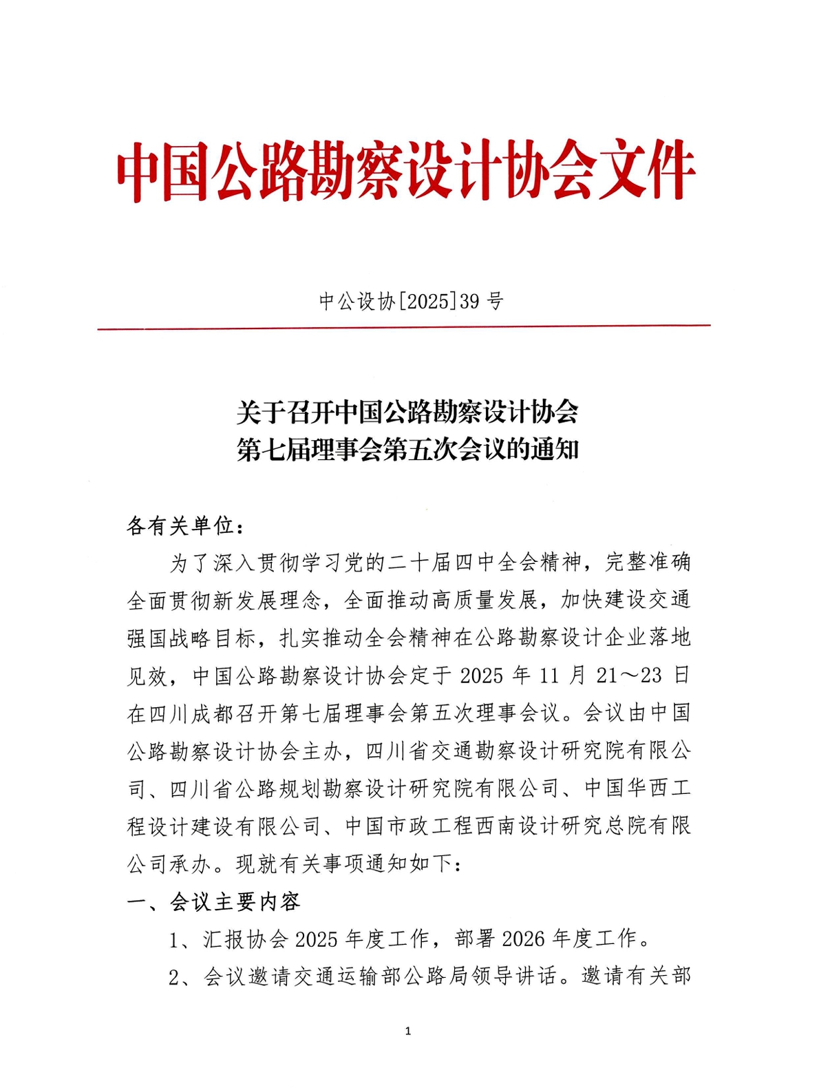 關于召開中國公路勘察設計協會第七屆理事會第五次會議的通知