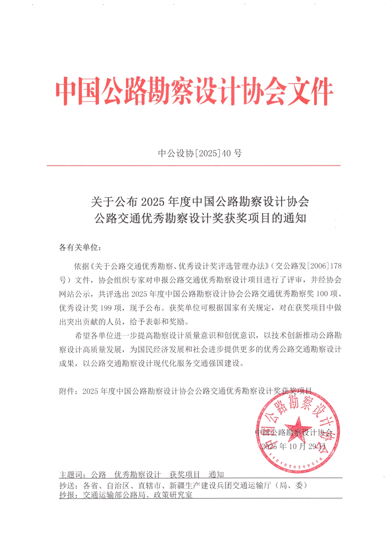 關(guān)于公布2025年度中國公路勘察設(shè)計協(xié)會公路交通優(yōu)秀勘察設(shè)計獎獲獎項目的通知